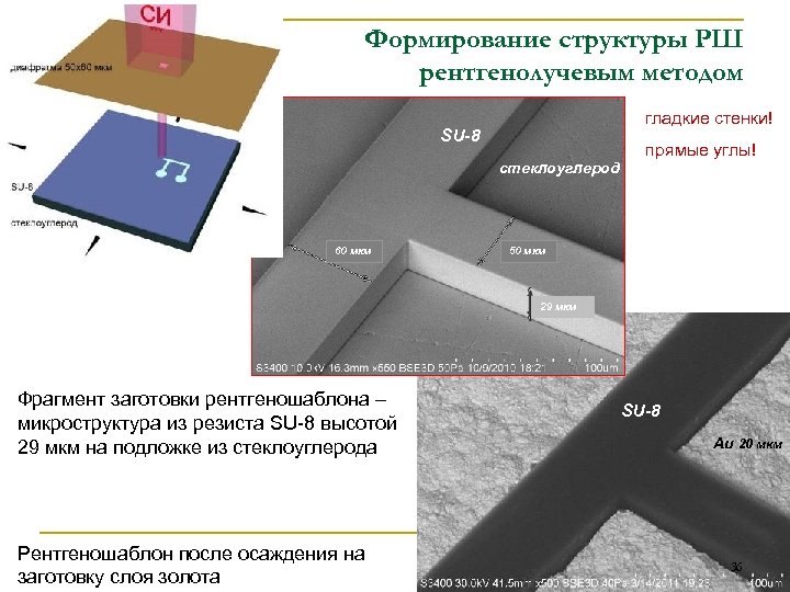 Формирование структуры РШ рентгенолучевым методом гладкие стенки! SU-8 стеклоуглерод 60 мкм прямые углы! 50 мкм 29 мкм Фрагмент заготовки рентгеношаблона – микроструктура из резиста SU-8 высотой 29 мкм на подложке из стеклоуглерода Рентгеношаблон после осаждения на заготовку слоя золота SU-8 Au 20 мкм 36