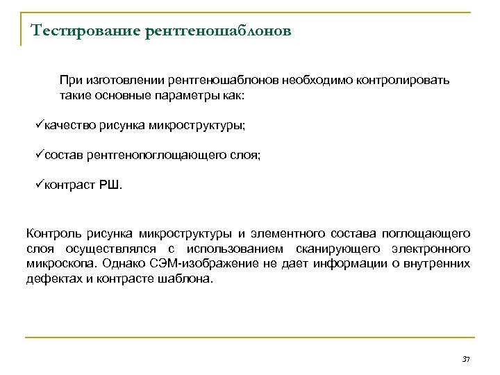 Тестирование рентгеношаблонов При изготовлении рентгеношаблонов необходимо контролировать такие основные параметры как: üкачество рисунка микроструктуры; üсостав рентгенопоглощающего слоя; üконтраст РШ. Контроль рисунка микроструктуры и элементного состава поглощающего слоя осуществлялся с использованием сканирующего электронного микроскопа. Однако СЭМ-изображение не дает информации о внутренних дефектах и контрасте шаблона. 37