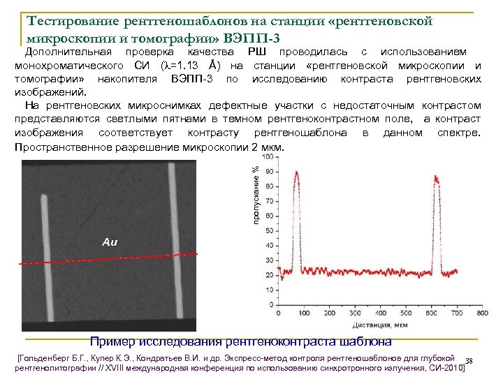 Тестирование рентгеношаблонов на станции «рентгеновской микроскопии и томографии» ВЭПП-3 пропускание % Дополнительная проверка качества РШ проводилась с использованием монохроматического СИ ( =1. 13 Å) на станции «рентгеновской микроскопии и томографии» накопителя ВЭПП-3 по исследованию контраста рентгеновских изображений. На рентгеновских микроснимках дефектные участки с недостаточным контрастом представляются светлыми пятнами в темном рентгеноконтрастном поле, а контраст изображения соответствует контрасту рентгеношаблона в данном спектре. Пространственное разрешение микроскопии 2 мкм. Au Пример исследования рентгеноконтраста шаблона [Гольденберг Б. Г. , Купер К. Э. , Кондратьев В. И. и др. Экспресс-метод контроля рентгеношаблонов для глубокой 38 рентгенолитографии // XVIII международная конференция по использованию синхротронного излучения, СИ-2010]