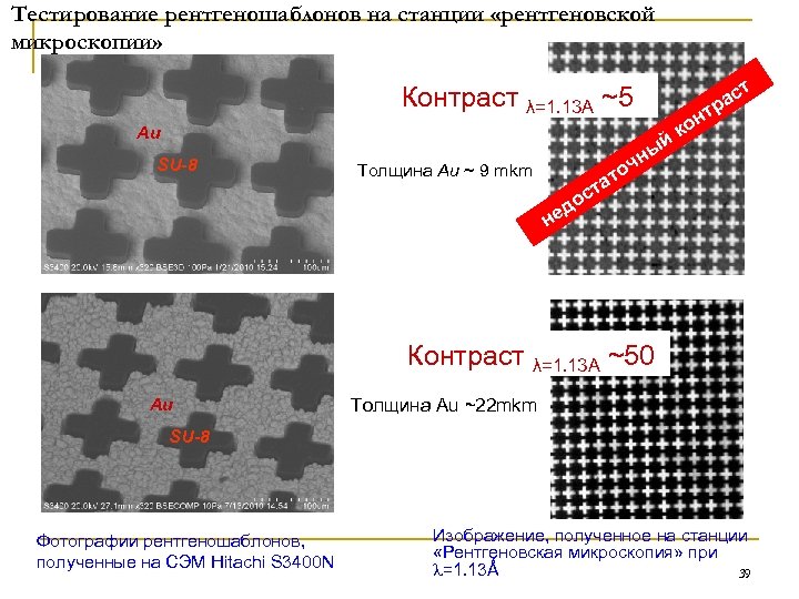 Тестирование рентгеношаблонов на станции «рентгеновской микроскопии» Контраст λ=1. 13 A ~5 Au SU-8 Толщина Au ~ 9 mkm т с ра т он йк ы чн то а т ос д не Контраст λ=1. 13 A ~50 Au Толщина Au ~22 mkm SU-8 Фотографии рентгеношаблонов, полученные на СЭМ Hitachi S 3400 N Изображение, полученное на станции «Рентгеновская микроскопия» при =1. 13Ǻ 39