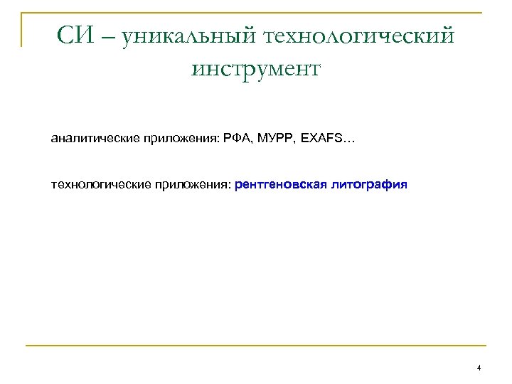 СИ – уникальный технологический инструмент аналитические приложения: РФА, МУРР, EXAFS… технологические приложения: рентгеновская литография 4