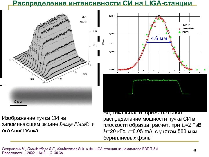 Распределение интенсивности СИ на LIGA-станции 0, 0015 расчет Image Plate ПДПП 4. 6 мм 2 W/мм 0, 0010 0, 0005 0, 0000 -8 -6 -4 -2 0 2 4 6 8 мм 10 мм Изображение пучка СИ на запоминающем экране Image Plate© и его оцифровка Вертикальное и горизонтальное распределение мощности пучка СИ в плоскости образца: расчет, при Е=2 Гэ. В, H=20 к. Гс, I=0. 05 m. А, с учетом 500 мкм бериллиевых фольг, Генцелев А. Н. , Гольденберг Б. Г. , Кондратьев В. И. и др. LIGA-станция на накопителе ВЭПП-3 // Поверхность. - 2002. - № 9. - С. 30 -35. 41
