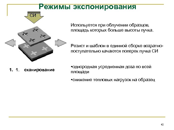Режимы экспонирования СИ Испольуется при облучении образцов, площадь которых больше высоты пучка. Резист и шаблон в единной сборке возратнопоступательно качаются поперек пучка СИ 1. 1. сканирование • однородная усредненная доза по всей площади • снижение тепловых нагрузок на образец 42