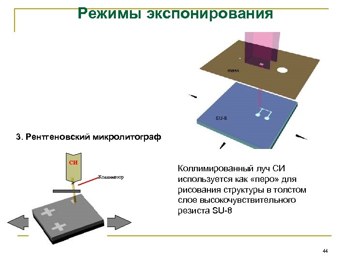 Режимы экспонирования 3. Рентгеновский микролитограф СИ Коллиматор Коллимированный луч СИ используется как «перо» для рисования структуры в толстом слое высокочувствительного резиста SU-8 44