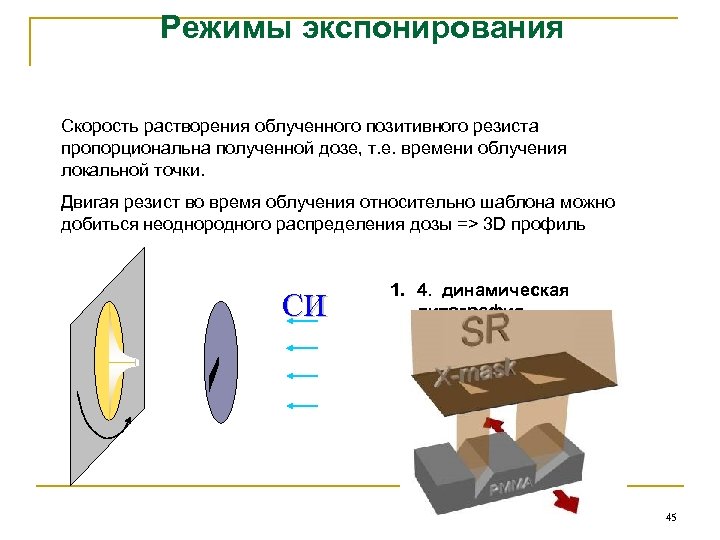 Режимы экспонирования Скорость растворения облученного позитивного резиста пропорциональна полученной дозе, т. е. времени облучения локальной точки. Двигая резист во время облучения относительно шаблона можно добиться неоднородного распределения дозы => 3 D профиль СИ 1. 4. динамическая литография 45