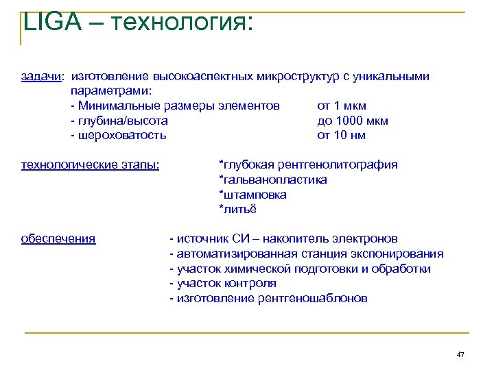 LIGA – технология: задачи: изготовление высокоаспектных микроструктур с уникальными параметрами: - Минимальные размеры элементов от 1 мкм - глубина/высота до 1000 мкм - шероховатость от 10 нм технологические этапы: обеспечения *глубокая рентгенолитография *гальванопластика *штамповка *литьё - источник СИ – накопитель электронов - автоматизированная станция экспонирования - участок химической подготовки и обработки - участок контроля - изготовление рентгеношаблонов 47