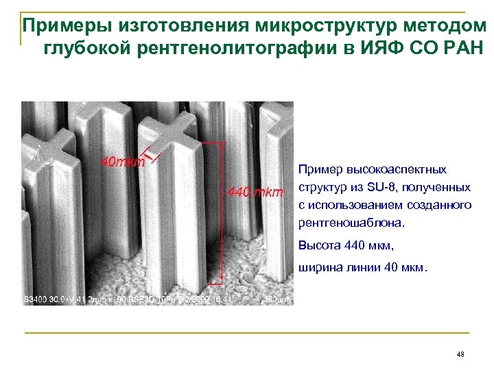 Примеры изготовления микроструктур методом глубокой рентгенолитографии в ИЯФ СО РАН Пример высокоаспектных структур из SU-8, полученных с использованием созданного рентгеношаблона. Высота 440 мкм, ширина линии 40 мкм. 48