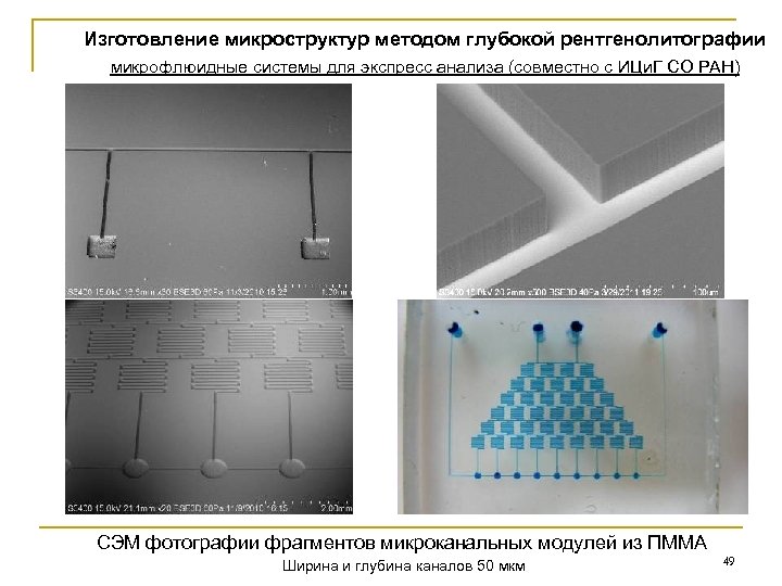 Изготовление микроструктур методом глубокой рентгенолитографии микрофлюидные системы для экспресс анализа (совместно с ИЦи. Г СО РАН) СЭМ фотографии фрагментов микроканальных модулей из ПММА Ширина и глубина каналов 50 мкм 49
