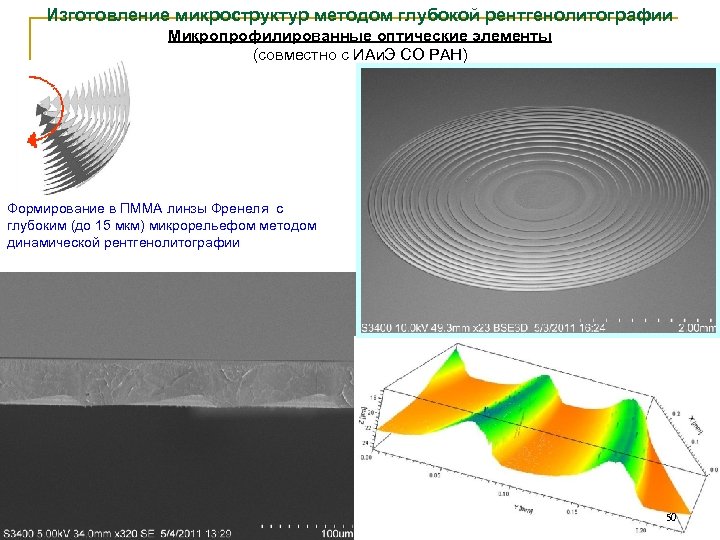Изготовление микроструктур методом глубокой рентгенолитографии Микропрофилированные оптические элементы (совместно с ИАи. Э СО РАН) Формирование в ПММА линзы Френеля с глубоким (до 15 мкм) микрорельефом методом динамической рентгенолитографии 50