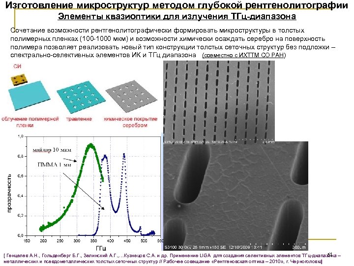 Изготовление микроструктур методом глубокой рентгенолитографии Элементы квазиоптики для излучения ТГц-диапазона Сочетание возможности рентгенолитографически формировать микроструктуры в толстых полимерных пленках (100 -1000 мкм) и возможности химически осаждать серебро на поверхность полимера позволяет реализовать новый тип конструкции толстых сеточных структур без подложки – спектрально-селективных элементов ИК и ТГц диапазона (совместно с ИХТТМ СО РАН) 51 [ Генцелев А. Н. , Гольденберг Б. Г. , Зелинский А. Г. , …Кузнецов С. А. и др. Применение LIGA для создания селективных элементов ТГц-диапазона – металлических и псевдометаллических толстых сеточных структур // Рабочее совещание «Рентгеновская оптика – 2010» , г. Черноголовка ]