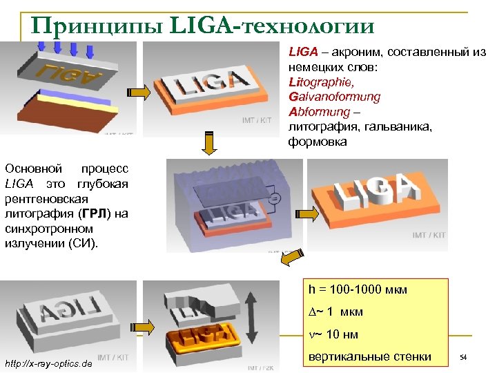 Принципы LIGA-технологии LIGA – акроним, составленный из немецких слов: Litographie, Galvanoformung Abformung – литография, гальваника, формовка Основной процесс LIGA это глубокая рентгеновская литография (ГРЛ) на ГРЛ синхротронном излучении (СИ). h = 100 -1000 мкм D~ 1 мкм n~ 10 нм http: //x-ray-optics. de вертикальные стенки 54