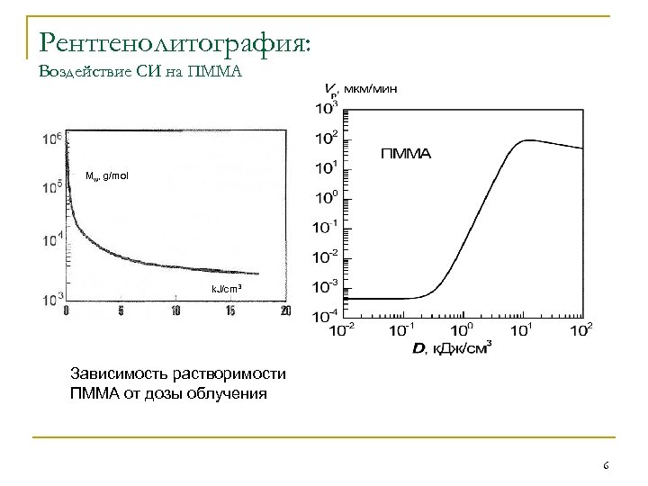 Рентгенолитография: Воздействие СИ на ПММА Mw, g/mol k. J/cm 3 Зависимость растворимости ПММА от дозы облучения 6