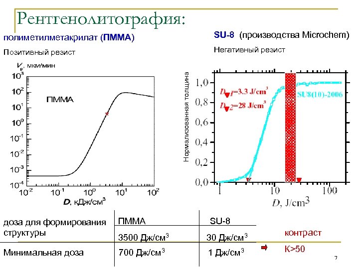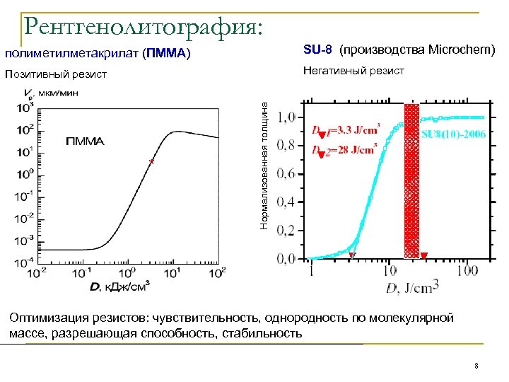 Рентгенолитография: SU-8 (производства Microchem) Позитивный резист Негативный резист Нормализованная толщина полиметилметакрилат (ПММА) * доза для формирования структуры ПММА SU-8 3500 Дж/см 3 30 Дж/см 3 Минимальная доза 700 Дж/см 3 1 Дж/см 3 контраст К>50 7