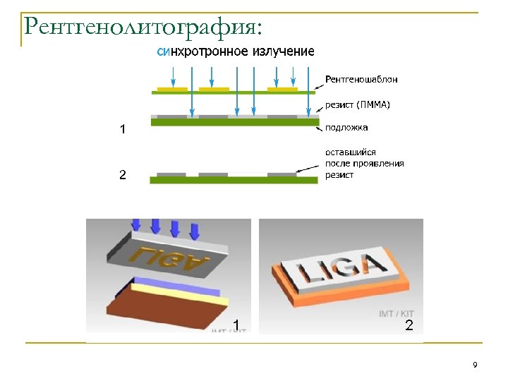 Рентгенолитография: SU-8 (производства Microchem) Позитивный резист Негативный резист * Нормализованная толщина полиметилметакрилат (ПММА) Оптимизация резистов: чувствительность, однородность по молекулярной массе, разрешающая способность, стабильность 8