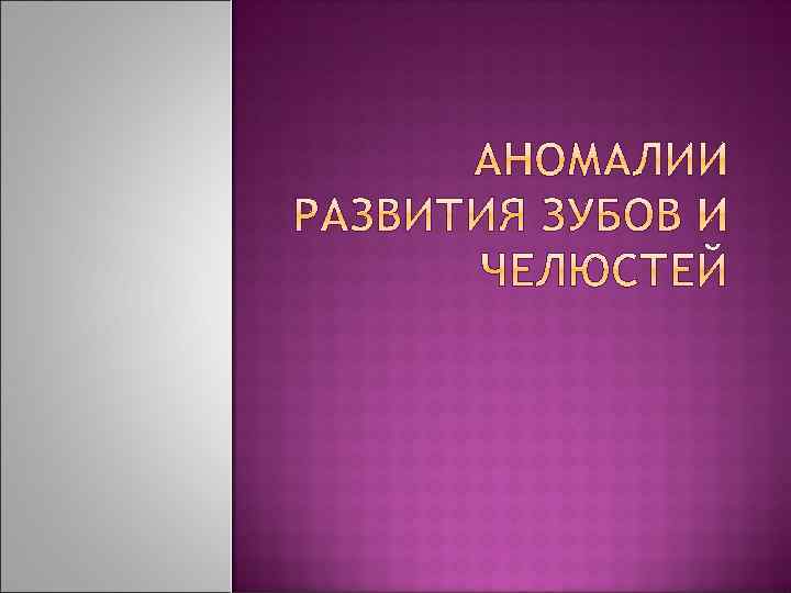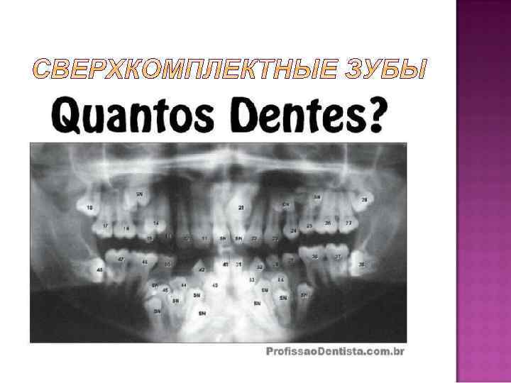 Адентия врожденная – полное отсутствие зубов Гипердентия врожденная (полиодонтия, гиперодонтия, супрадентия, зубы сверхкомплектные) — избыточное количество зубов обусловленная развитием сверхкомплектных зубов; гиподонтия (син. : олигодентия) — уменьшенное по сравнению с нормой количество зубов, что связано с отсутствием их зачатков