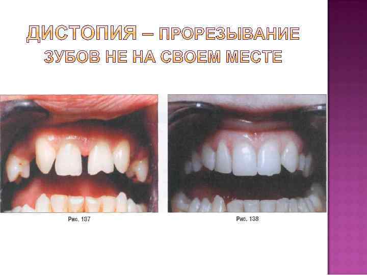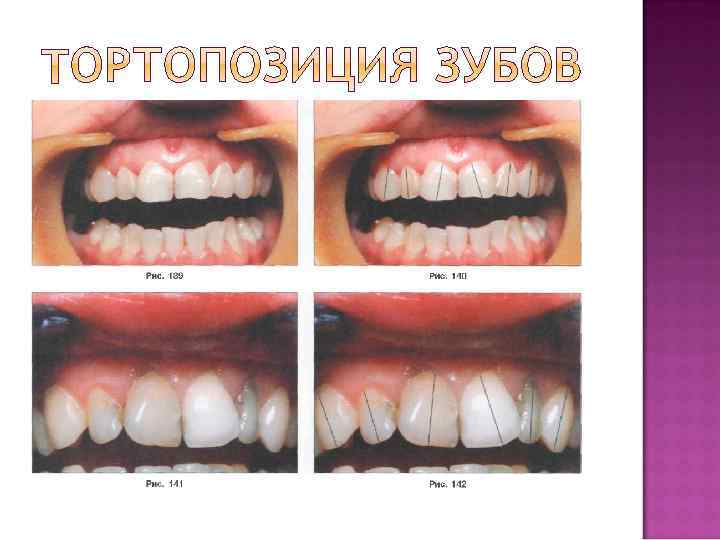 тортопозиция зубов (син. : тортоаномалия) поворот зуба вокруг продольной оси; транспозиция зубов - неправильное расположение зуба в зубной дуге, связанное с перемещением на место, предназначенное для соседнего зуба; диастема - щель между центральными резцами (отклонение коронок при правильном расположении верхушек их корней или корпусное латеральное смещение зубов); тремы - промежутки между зубами краудинг (син. : скучивание зубов) - расположение зубов одной группы как бы в два ряда; гетеротопия зубов - прорезывание зубов в необычном месте, например, в преддверии полости носа, связано с гетеротопией зубного зачатка.
