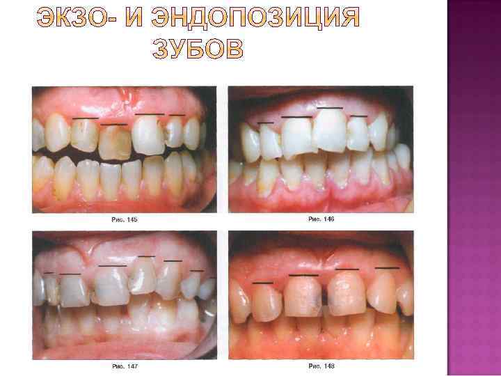 экзопозиция зубов (син. : пропозиция зубов) смещение или наклон передних зубов кнаружи от зубного ряда; эндопозиция зубов (син. : ретропозиция зубов) — смещение или наклон передних зубов кнутри от зубного ряда; дистопозиция зубов - наклон или корпусное смещение боковых зубов кзади по зубной дуге; мезиопозиция зубов - наклон или корпусное смещение боковых зубов кпереди по зубной дуге; супрапозиция зубов - окклюзионная поверхность зуба располагается выше окклюзионной плоскости зубного ряда; инфрапозиция зубов - окклюзионная поверхность зуба располагается ниже окклюзионной плоскости зубного ряда;