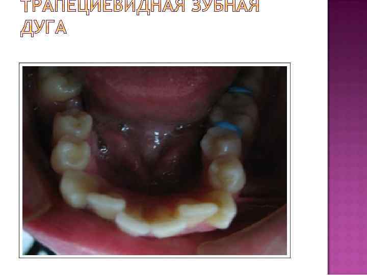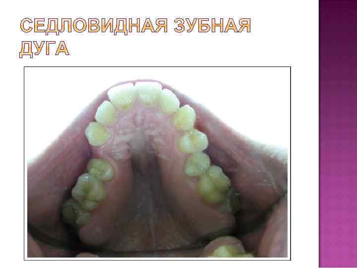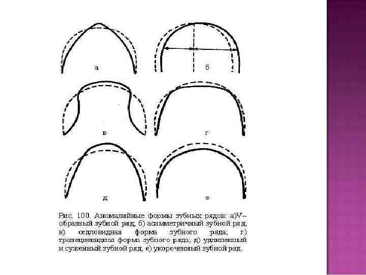 Сужение зубных дуга зубная остроугольная - сужение локализуется в области клыков; дуга зубная седловидная - сужение наиболее выражено в области моляров; дуга зубная V-образная - зубной ряд сужен в боковых участках, а передний участок выступает в виде острого угла; дуга зубная трапециевидная - сужен и уплощен передний участок зубного ряда; дуга зубная общесуженная - все зубы (передние и боковые) располагаются ближе к срединной плоскости, чем в норме Расширение зубных дуг тремы – щели между зубами