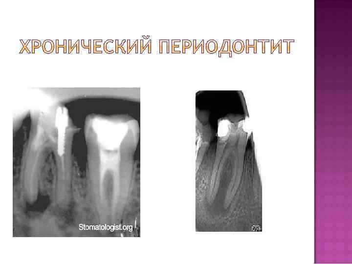 Острый периодонтит – часто не дает рентгенологических изменений, но может проявляться расширением периодонтальной щели, которое обусловлено отеком связки зуба, костной резорбции начинают обнаруживаться через 4— 7 дней после начала острого воспаления