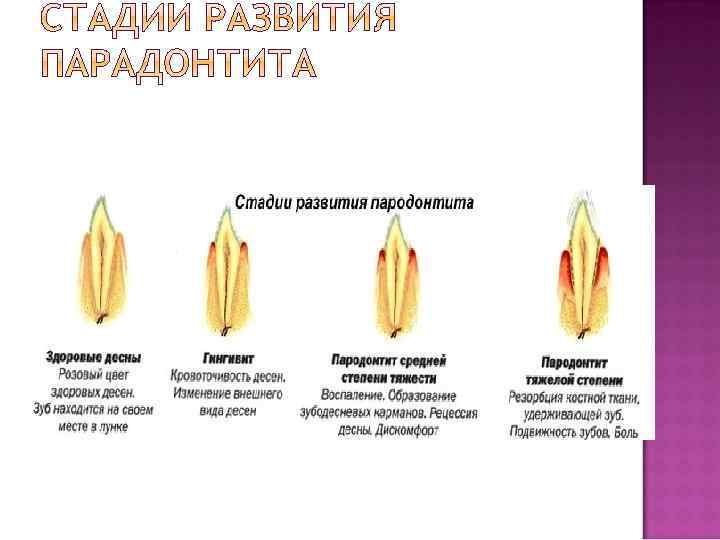 Начальная – остеопороз вершин межальвеолярных перегородок, нечеткость, а затем, изчесзновение кортикальной пластинки на этой вершине и остеопороз губчатого вещества 1 степень – уменьшение межальвеолярных перегородок до 1/3 длины корня зуба; зуба 2 степень – уменьшение межальвеолярных перегородок до 1/2 длины корня зуба; 3 степень – уменьшение межальвеолярных перегородок до 2/3 длины корня зуба и более;
