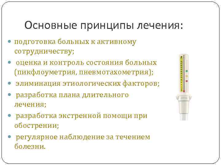 Основные принципы лечения: подготовка больных к активному сотрудничеству; оценка и контроль состояния больных (пикфлоуметрия, пневмотахометрия); элиминация этиологических факторов; разработка плана длительного лечения; разработка экстренной помощи при обострении; регулярное наблюдение за течением болезни.