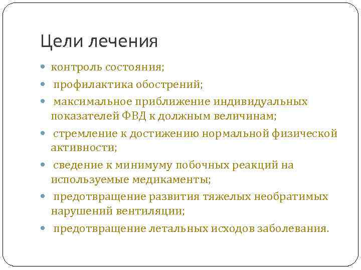 Цели лечения контроль состояния; профилактика обострений; максимальное приближение индивидуальных показателей ФВД к должным величинам; стремление к достижению нормальной физической активности; сведение к минимуму побочных реакций на используемые медикаменты; предотвращение развития тяжелых необратимых нарушений вентиляции; предотвращение летальных исходов заболевания.