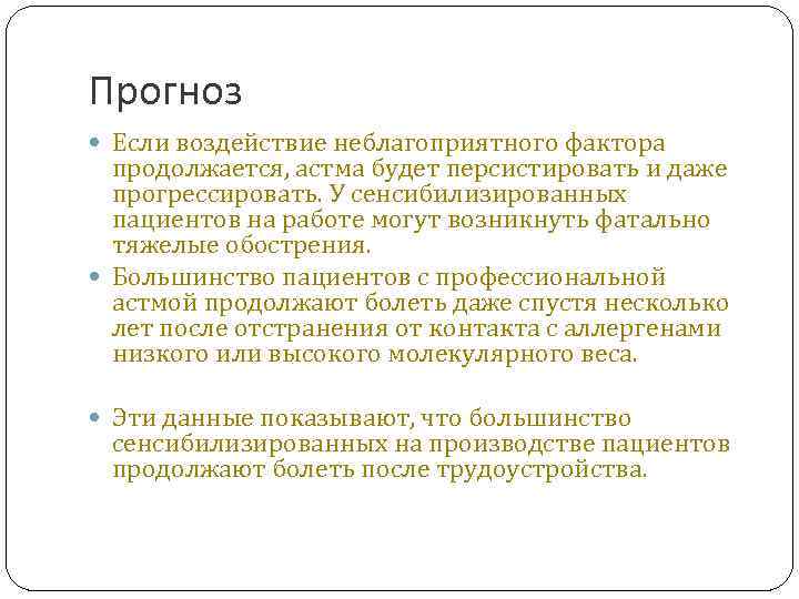 Прогноз Если воздействие неблагоприятного фактора продолжается, астма будет персистировать и даже прогрессировать. У сенсибилизированных пациентов на работе могут возникнуть фатально тяжелые обострения. Большинство пациентов с профессиональной астмой продолжают болеть даже спустя несколько лет после отстранения от контакта с аллергенами низкого или высокого молекулярного веса. Эти данные показывают, что большинство сенсибилизированных на производстве пациентов продолжают болеть после трудоустройства.