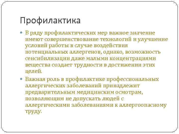 Профилактика В ряду профилактических мер важное значение имеют совершенствование технологий и улучшение условий работы в случае воздействия потенциальных аллергенов, однако, возможность сенсибилизации даже малыми концентрациями вещества создает трудности в достижении этих целей. Важная роль в профилактике профессиональных аллергических заболеваний принадлежит предварительным медицинским осмотрам, позволяющим не допускать людей с аллергическими заболеваниями к аллергоопасному труду.