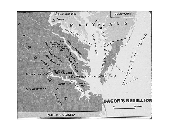 But Then… • Bacon dies suddenly • Rebellion fades out • HOUSE OF BURGESSES – VA Assembly votes to lower taxes and open up some land