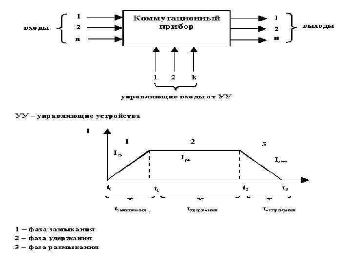 Коммутация құрылғыларының жұмыс істеу принципі • Іске қосылу фазасы (замыкания), қосылу уақыт ұзақтығы басқару қондырғы тізбектерінің сұлбасына, құрылым ерекшелігіне байланысты орындалады; • Ұстап тұру фазасы (активное состояние), ұзақтығы қондырғы функциясына байланысты; • Ажырату фазасы (отпускания), ажырату уақыт ұзақтығы басқару қондырғы тізбектерінің сұлбасына, құрылым ерекшелігіне байланысты орындалады;