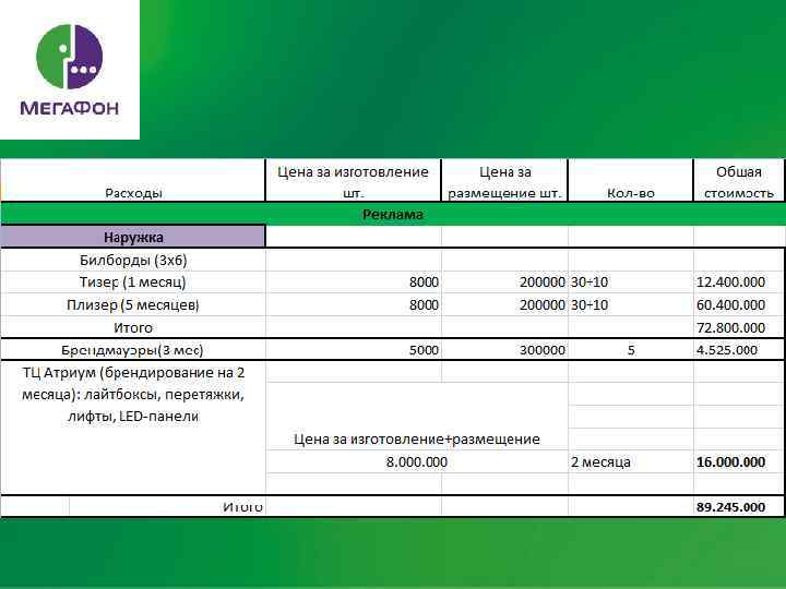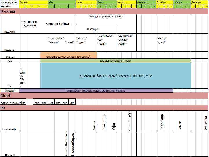 POS - Штендеры - Световые панели Печатная Буклеты Прессовая Журналы Интернет -VK, FB, Yandex, Rambler, Afisha, Lenta. ru Direct - промо-сайт - смс рассылка Наружка - Билборды - Брэндмауэры - Реклама в метро - В ТЦ Москва, Новосибирск TV Реклама 1. Тизер 2. Основной рекламный ролик PR -Пресс-конференции -Выставки Сотрудники - мотивационные программы - обучение