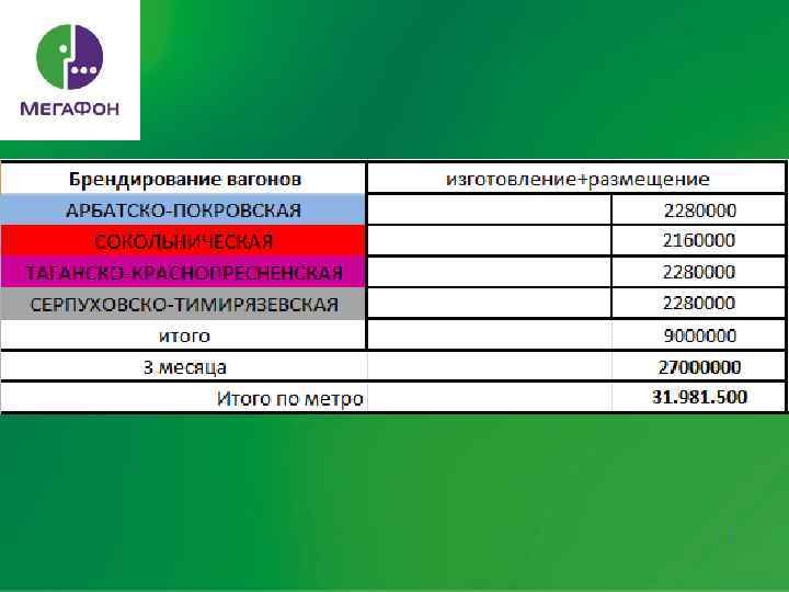 Рекламная активность Наружка: - 40 билбордов по МСК и 10 по Новосиб. - 5 брендмауэров по МСК - брендирование в ТЦ Атриум Метро: - Брендирование эскалаторов по кольцу на выход в город и переход - брендирование вагонов по Арбатскопокровской, Сокольнической, Таганскокраснопресненской, Серпуховскотимирязевской линиям.