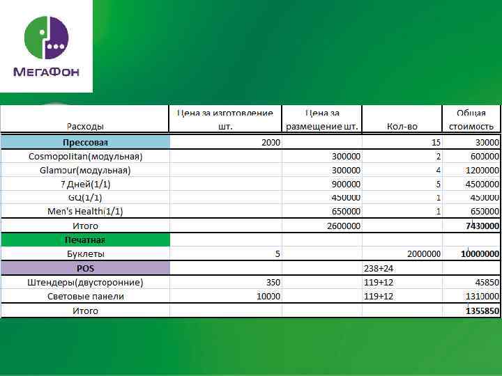 Рекламная активность Прессовая: В журналах: Cosmopolitan (2) Glamour(4) 7 дней(15) Men’s Health(1) "GQ"(1) Интернет: -Медийная, контекстная реклама на Yandex, Vk, Afisha. ru, Lenta. ru. -кобрендинг с Nokia Печатная: Буклеты в салонах Мегафона, Иона, Связного.
