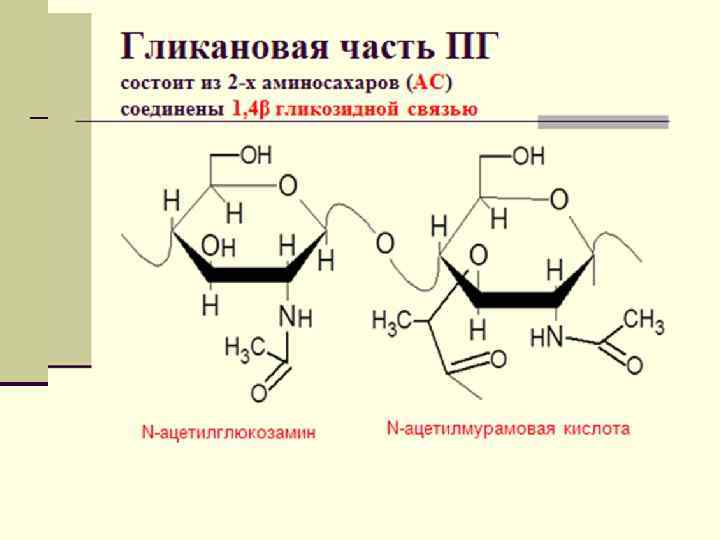 1 вопрос Строение пептидогликана (ПГ) клеточной стенки n ПГ- главный компонент КС бактерий (только у бактерий) n ПГ = муреин (от лат. Murus – стена) n ПГ - гетерополимер n ПГ – сложный комплекс, n состоит из 2 -х частей: n 1. гликановая часть n 2. пептидная часть