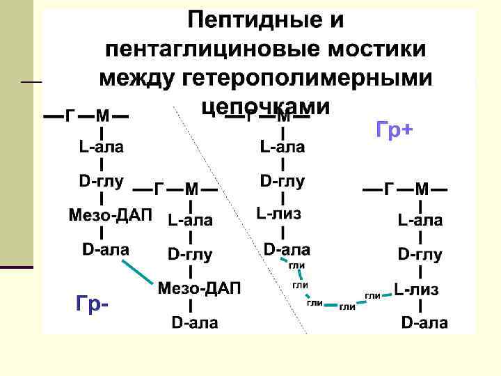 Типы связей в молекуле ПГ n 1. гликозидная (между АС) n 2. пептидные (Гр+ и Гр-) n 3. пентаглициновые мостики (Гр+) n Строение ПГ необходимо учитывать при создании новых АМП n ПГ – основная мишень для АМП у бактерий
