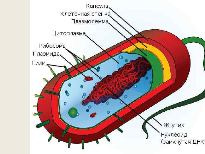 Строение бактериальной клетки 1 — клеточная стенка, 2 — наружная цитоплазматическая мембрана, 3 — хромосома (кольцевая молекула ДНК), 4 — впячивание наружной цитоплазматической мембраны, 5 — включения 6 — мезосома (вырост наружной цитоплазматической мембраны), 7 — стопки мембран, в которых осуществляется фотосинтез, 8 — рибосома, 9 — жгутики.