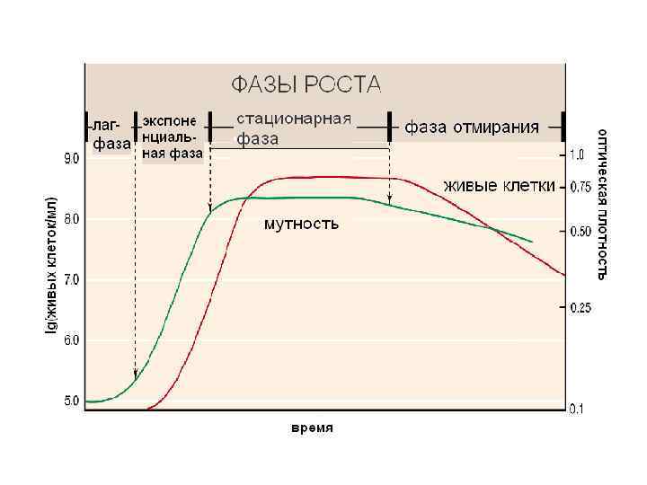 Кинетика роста микрорганизмов Фазы роста бактерий в периодической культуре I лаг фаза, II – логарифмическая фаза, III фаза замедленного роста, IV – стационарая фаза, V – фаза отмирания. Х – концентрация клеток, 106 кл/мл
