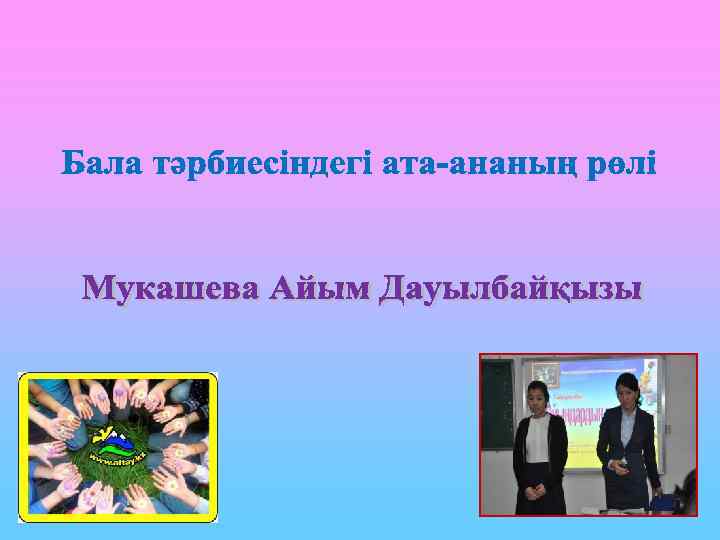 Бала тәрбиесіндегі ата-ананың рөлі Тақырыбы: “Бала тәрбиесіндегі ата-ананың рөлі” Мақсаты: Қазіргі кездегі баланың дамуына, жеке тұлға болып қалыптасуына ата-ана тәрбиесінің әдіс-тәсілдерін жетілдіре отырып, қарым-қатынас орнату және ұлттық сананы бойына сіңіру. Ата-аналардың балабақшамен, тәрбиешімен тығыз байланысын арттыру. Балалармен бірге мейірімділікке, ұстамдылыққа тәрбиелеудің жолдарын көрсету. Бала тәрбиелеу сапасының аз да болса жоғарлауына ықпал ету. Әдістері: пікір алмасу, сұрақ-жауап, сауалнама, ойын, психологиялық жаттығулар. Көрнекілік: қалам, стикер, қағаз, суреттер, лента, майшам, музыка жазылған үн таспа