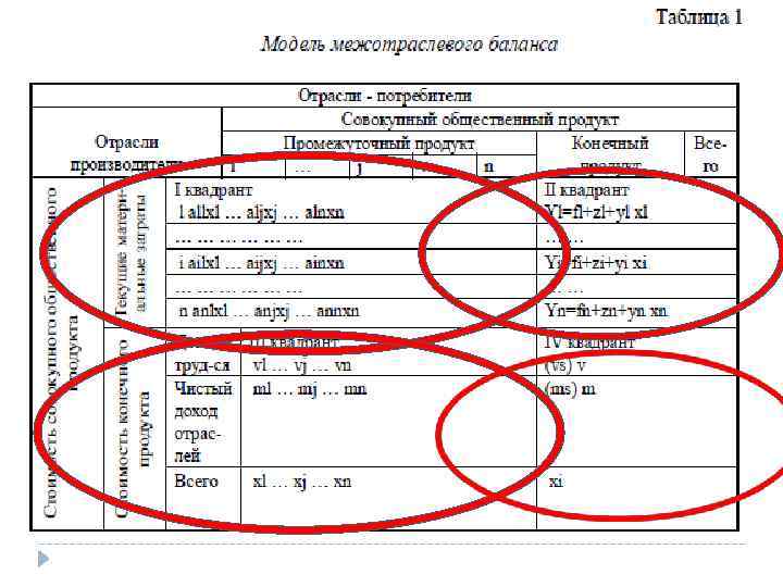 СОСТАВЛЯЮЩИЕ МОДЕЛИ • • • i - продукция отрасли aij - затраты, стоимостные или натуральные, отрасли i на единицу продукции отрасли j yi - продукция, поступающая в конечное потребление zi - общественное и личное потребление fi - накопление ei – экспорт xi = Σxij + yi - стоимость всей продукции отрасли i vi - материальные затраты, затраты на рабочую силу mi - чистый доход xi = Σxij + Vi + mi – структура стоимости отрасли