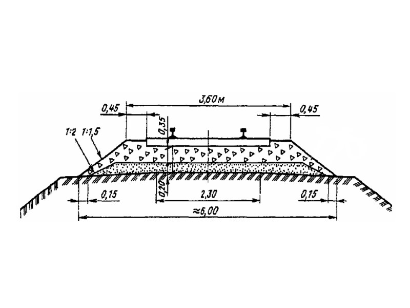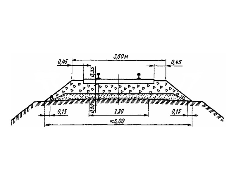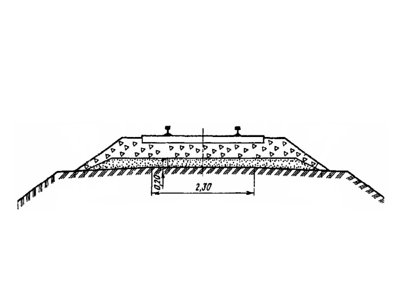 Поперечный профиль балластной призмы на однопутном участке (прямой путь, деревянные шпалы).