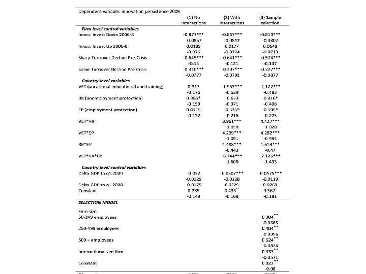 conclusions • RR (our measure of unemployment protection) and VET are complementary. • So are EP and VET. • When both forms of income insurance are low, VET is actually associated with lower levels of innovation persistence