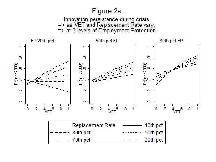 • income insurance / VET systems have a comparative advantage in the production of specific skills, this supports the view that specific skills are better for sustaining innovation during a crisis than general skills. • We find no substantial difference between the performance of flexicurity (high RR, high VET) and non-liberal (strong EP, high VET) systems.