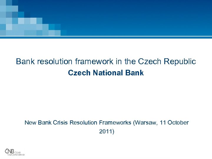 Bank resolution framework in the Czech Republic Czech National Bank New Bank Crisis Resolution Frameworks (Warsaw, 11 October 2011)