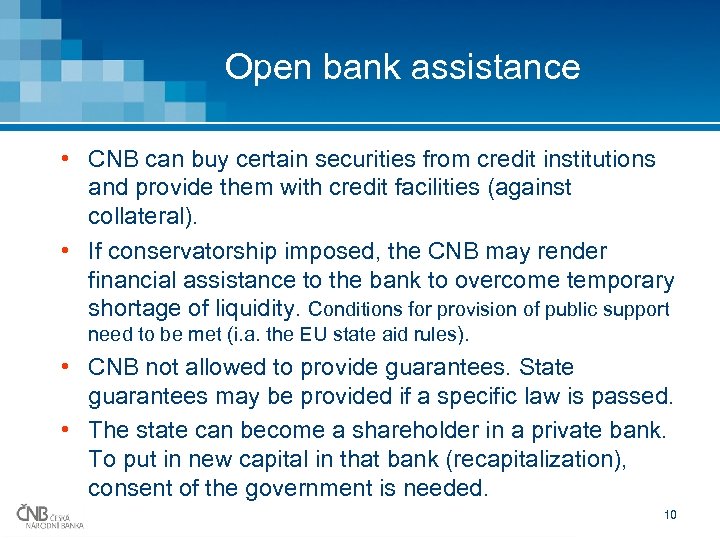 Bridge Bank • A special state owned bank to acquire an enterprise of a distressed bank [2009]. • Cannot be used for credit unions. • Needs to have the minimum capital as required by the Act on Banks (CZK 500 M = EUR 20 mln), other aspects of licensing are significantly simplified/sped-up. • The contract on the enterprise transfer would be signed by the management + consent of General Meeting. • If conservatorship was introduced, the contract would be signed only by the conservator. 9