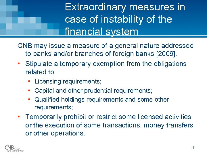 Open bank assistance • CNB can buy certain securities from credit institutions and provide them with credit facilities (against collateral). • If conservatorship imposed, the CNB may render financial assistance to the bank to overcome temporary shortage of liquidity. Conditions for provision of public support need to be met (i. a. the EU state aid rules). • CNB not allowed to provide guarantees. State guarantees may be provided if a specific law is passed. • The state can become a shareholder in a private bank. To put in new capital in that bank (recapitalization), consent of the government is needed. 10