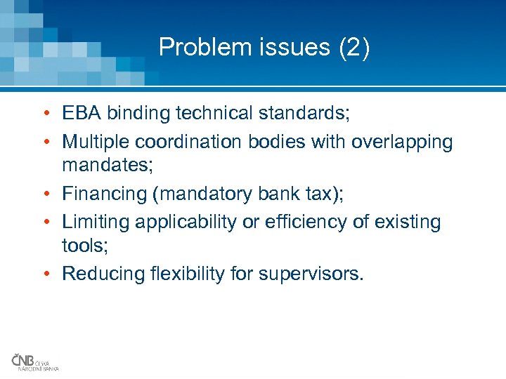 Problem issues (2) • EBA binding technical standards; • Multiple coordination bodies with overlapping mandates; • Financing (mandatory bank tax); • Limiting applicability or efficiency of existing tools; • Reducing flexibility for supervisors.