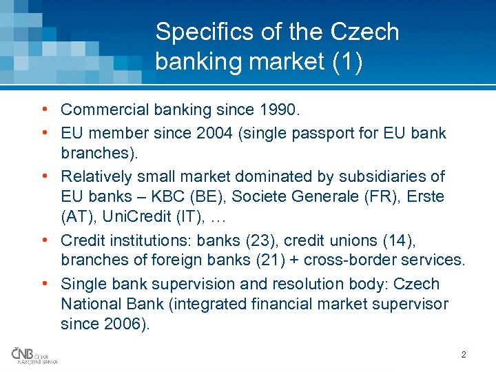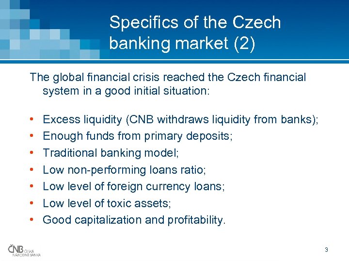 Specifics of the Czech banking market (1) • Commercial banking since 1990. • EU member since 2004 (single passport for EU bank branches). • Relatively small market dominated by subsidiaries of EU banks – KBC (BE), Societe Generale (FR), Erste (AT), Uni. Credit (IT), … • Credit institutions: banks (23), credit unions (14), branches of foreign banks (21) + cross-border services. • Single bank supervision and resolution body: Czech National Bank (integrated financial market supervisor since 2006). 2