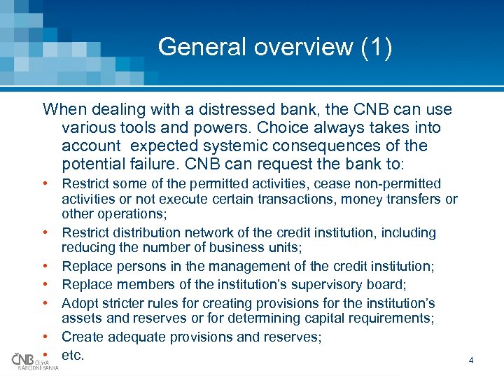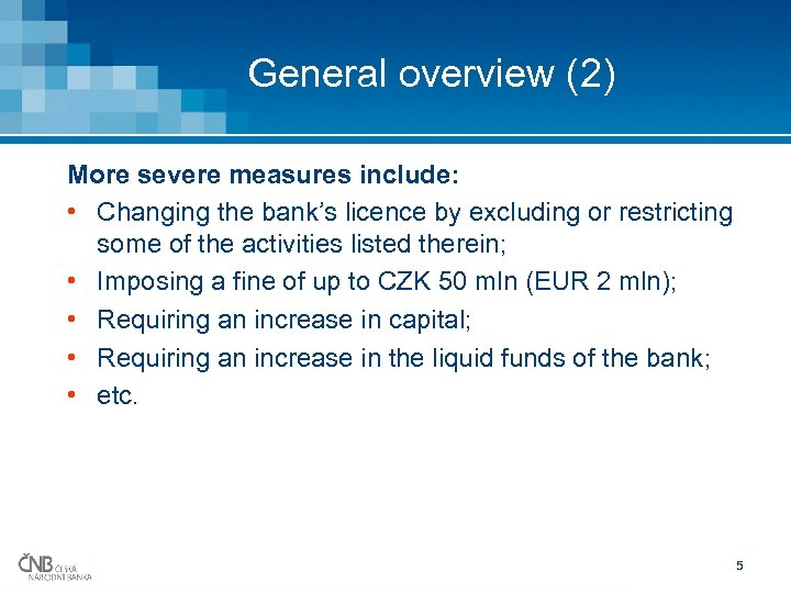 General overview (1) When dealing with a distressed bank, the CNB can use various tools and powers. Choice always takes into account expected systemic consequences of the potential failure. CNB can request the bank to: • Restrict some of the permitted activities, cease non-permitted activities or not execute certain transactions, money transfers or other operations; • Restrict distribution network of the credit institution, including reducing the number of business units; • Replace persons in the management of the credit institution; • Replace members of the institution’s supervisory board; • Adopt stricter rules for creating provisions for the institution’s assets and reserves or for determining capital requirements; • Create adequate provisions and reserves; • etc. 4