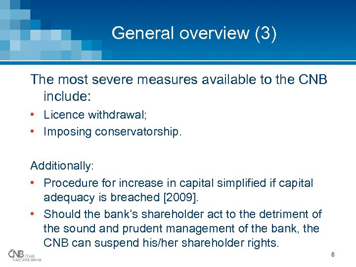 General overview (2) More severe measures include: • Changing the bank’s licence by excluding or restricting some of the activities listed therein; • Imposing a fine of up to CZK 50 mln (EUR 2 mln); • Requiring an increase in capital; • Requiring an increase in the liquid funds of the bank; • etc. 5