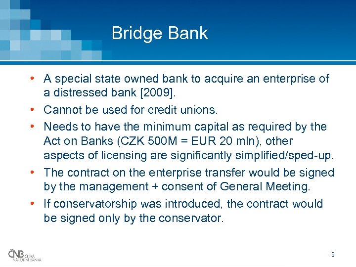 Conservatorship (2) During conservatorship: • The General Meeting of the bank does not take place; • The conservator decides on matters falling within the powers of the General Meeting; • If the conservator decides to increase the bank’s capital, he/she may in some cases exclude the shareholders’ preferential right to subscribe for new shares. 8